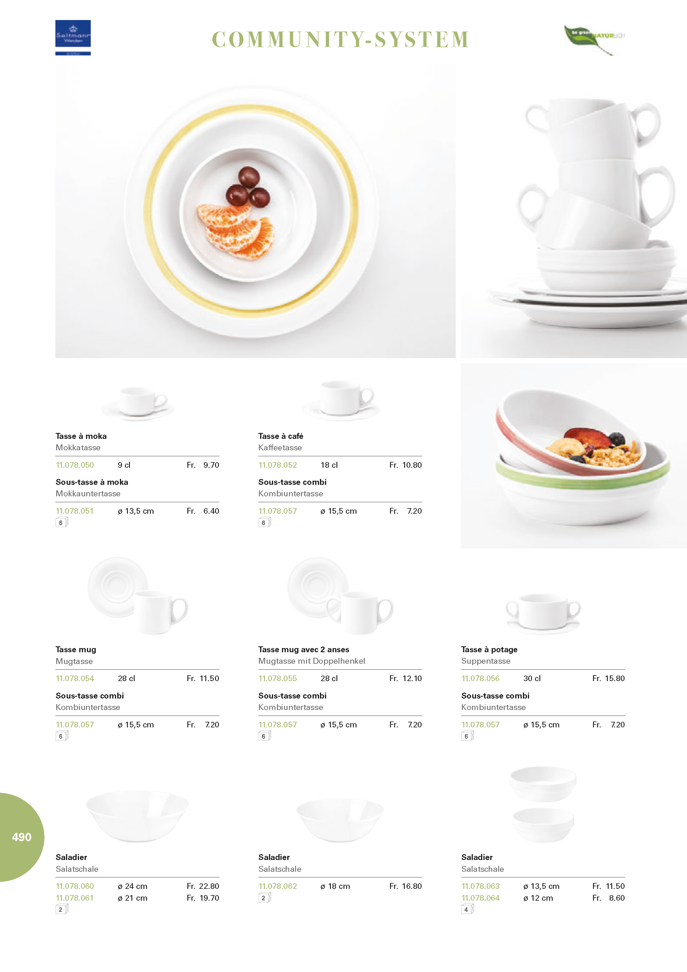490SaladierSalatschale11.078.060 %u00f8 24 cm Fr. 22.8011.078.061 %u00f8 21 cm Fr. 19.70SaladierSalatschale11.078.062 %u00f8 18 cm Fr. 16.80Tasse %u00e0 mokaMokkatasse11.078.050 9 cl Fr. 9.70Sous-tasse %u00e0 mokaMokkauntertasse11.078.051 %u00f8 13,5 cm Fr. 6.40Tasse %u00e0 caf%u00e9Kaffeetasse11.078.052 18 cl Fr. 10.80Sous-tasse combiKombiuntertasse11.078.057 %u00f8 15,5 cm Fr. 7.20Tasse mug avec 2 ansesMugtasse mit Doppelhenkel11.078.055 28 cl Fr. 12.10Sous-tasse combiKombiuntertasse11.078.057 %u00f8 15,5 cm Fr. 7.20Tasse %u00e0 potageSuppentasse11.078.056 30 cl Fr. 15.80Sous-tasse combiKombiuntertasse11.078.057 %u00f8 15,5 cm Fr. 7.20Tasse mugMugtasse11.078.054 28 cl Fr. 11.50Sous-tasse combiKombiuntertasse11.078.057 %u00f8 15,5 cm Fr. 7.20SaladierSalatschale11.078.063 %u00f8 13,5 cm Fr. 11.5011.078.064 %u00f8 12 cm Fr. 8.60COM M U N IT Y- S YST E M